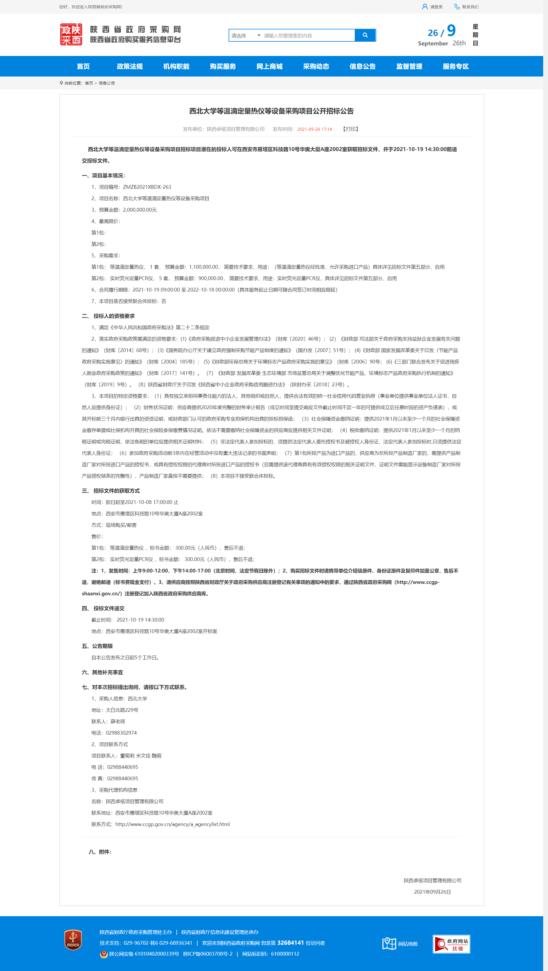 西北大学等温滴定量热仪等设备采购项目公开招标公告 作者: 编辑:采购与招标办公室 时间:2021-09-26 原公告地址:http://www.ccgp-shaanxi.gov.cn/notice/noticeDetail.do?noticeguid=8a85be317c20d707017c21545fc51220