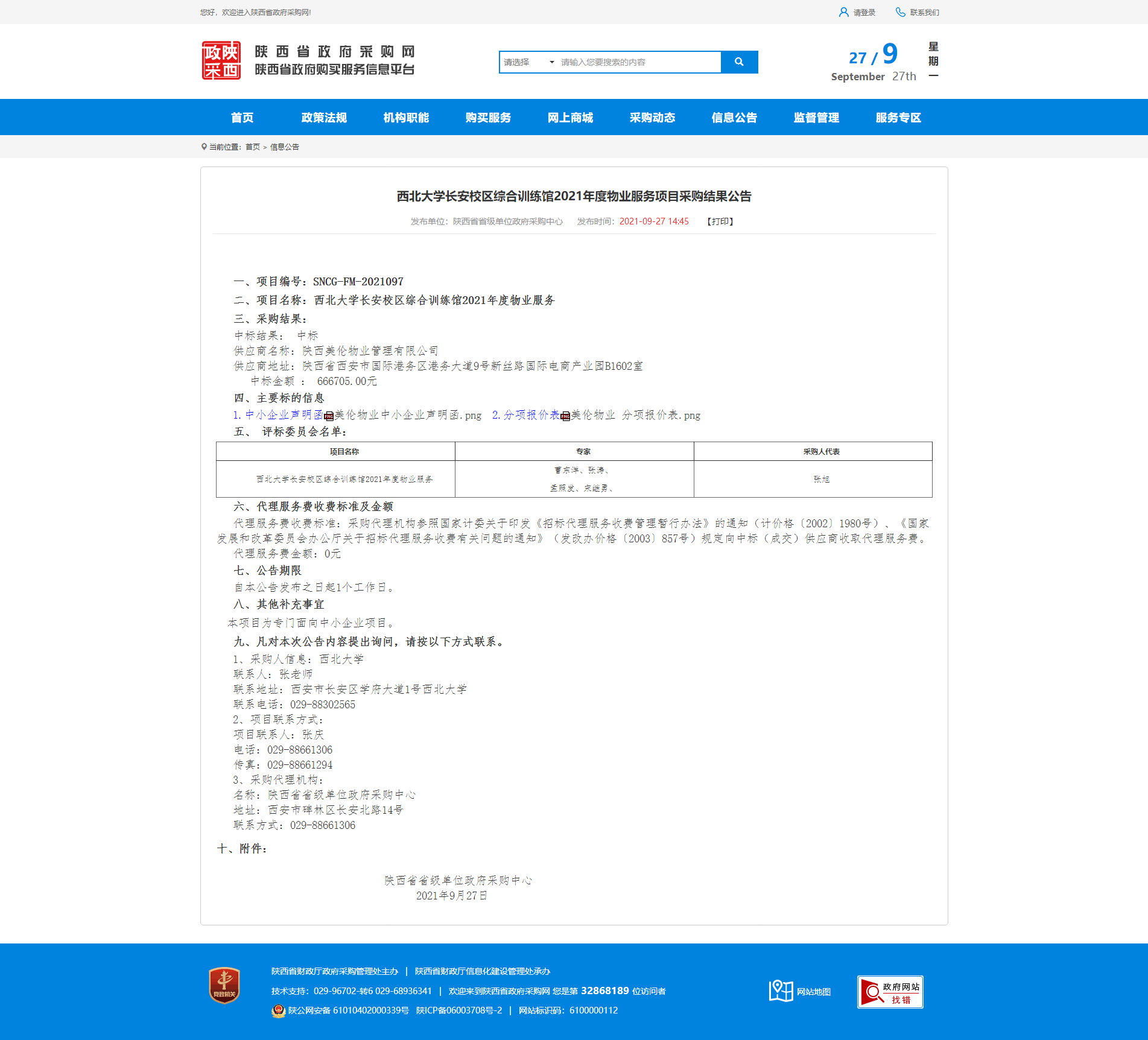 关于西北大学长安校区综合训练馆2021年度物业服务项目采购结果公告