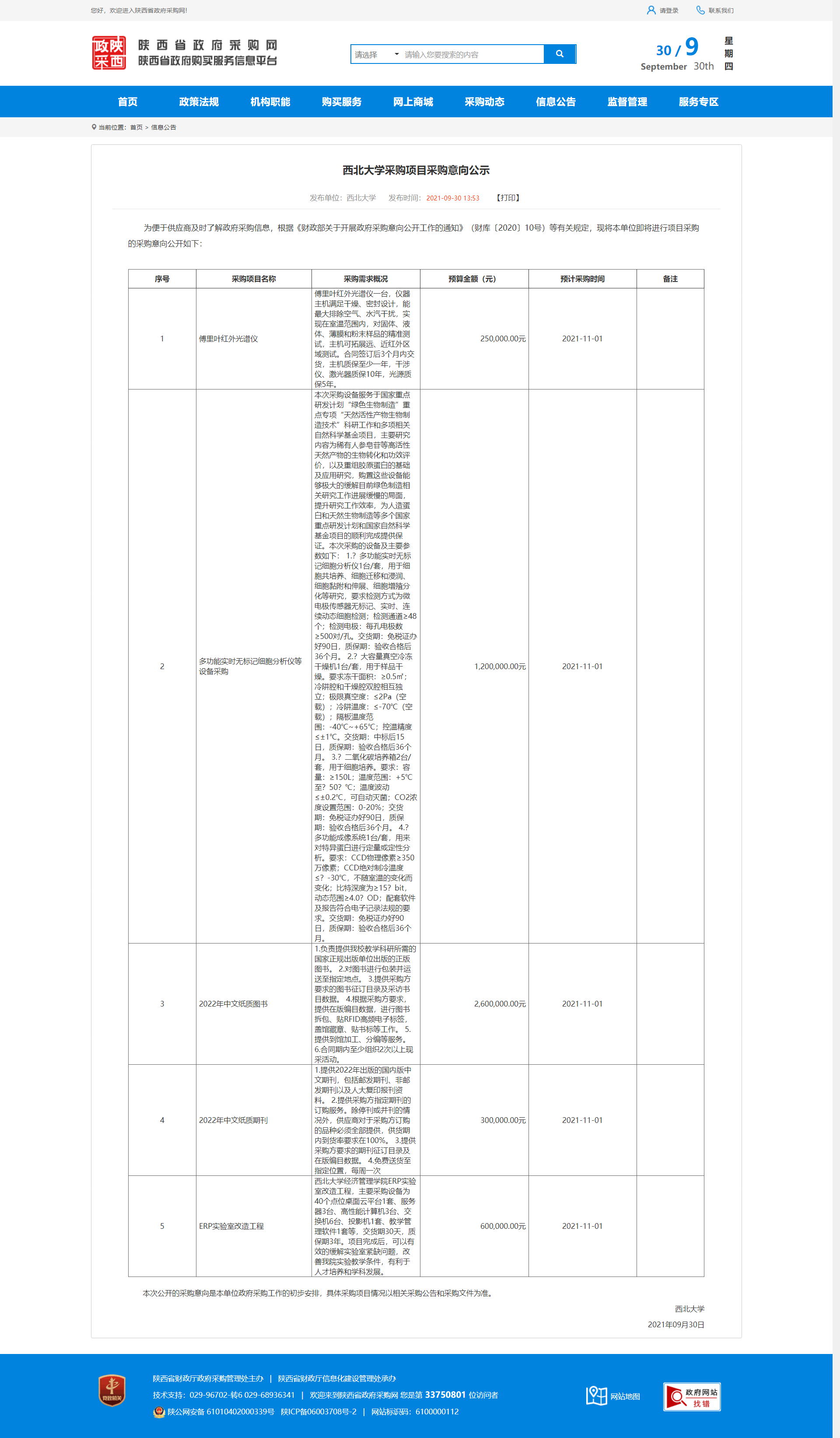 西北大学采购项目采购意向公示 作者: 编辑:采购与招标办公室 时间:2021-09-30 原公告地址:http://www.ccgp-shaanxi.gov.cn/notice/noticeDetail.do?noticeguid=8a85be337c20d0b4017c304013b92589