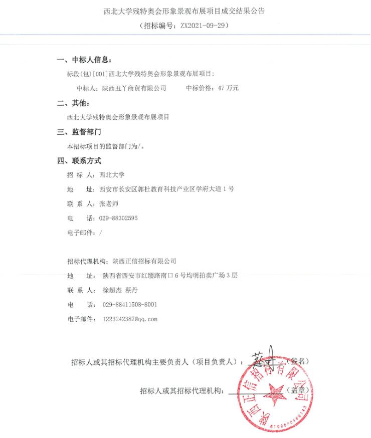 关于西北大学残特奥会形象景观布展项目成交结果公告
