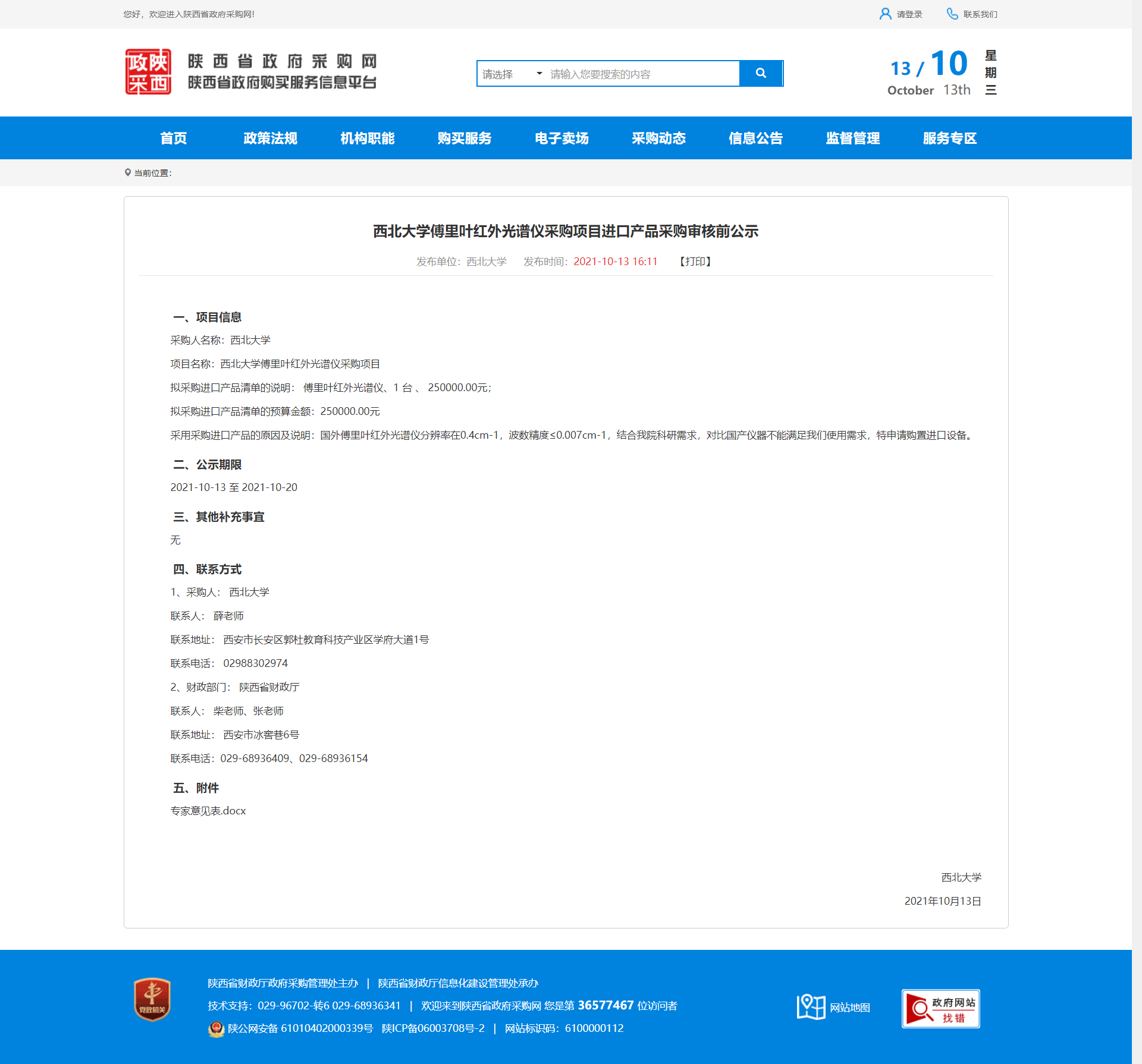 西北大学傅里叶红外光谱仪采购项目进口产品采购审核前公示 作者: 编辑:采购与招标办公室 时间:2021-10-13 原公告地址:http://www.ccgp-shaanxi.gov.cn/notice/noticeDetail.do?noticeguid=8a85be327c20d508017c78afc0e74db6