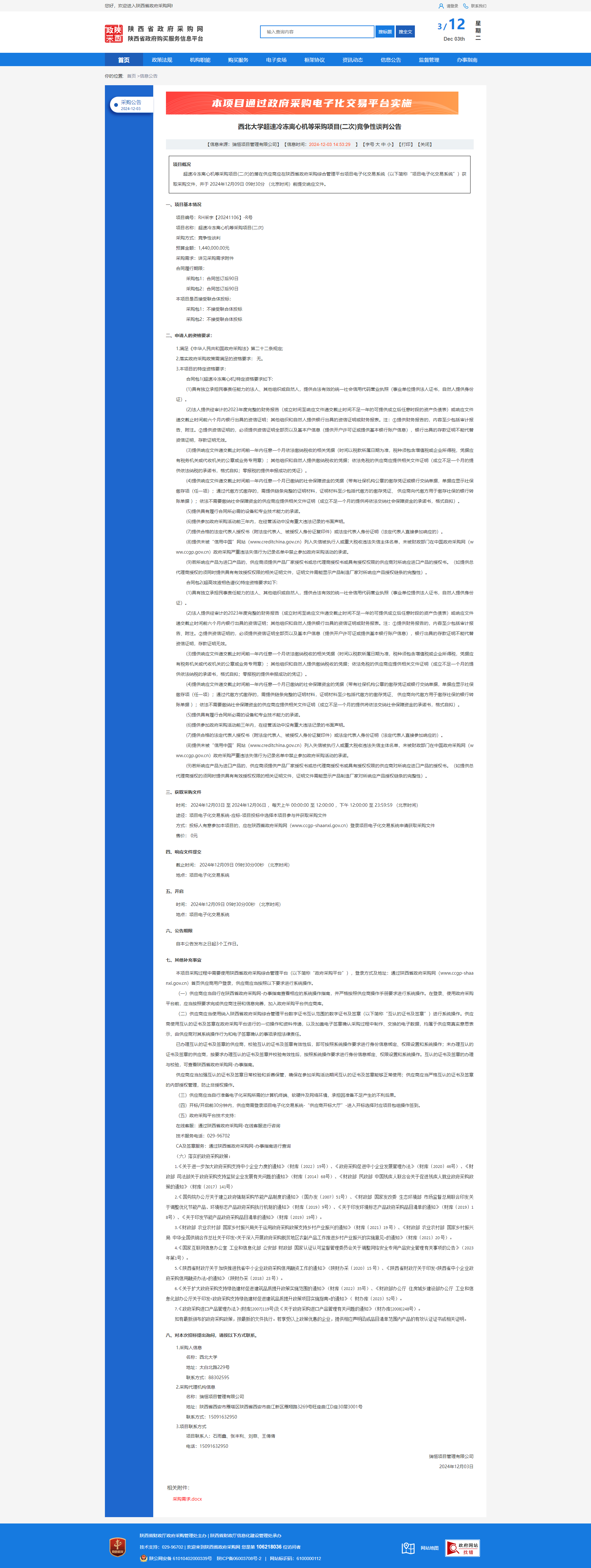 西北大学超速冷冻离心机等采购项目(二次)竞争性谈判公告