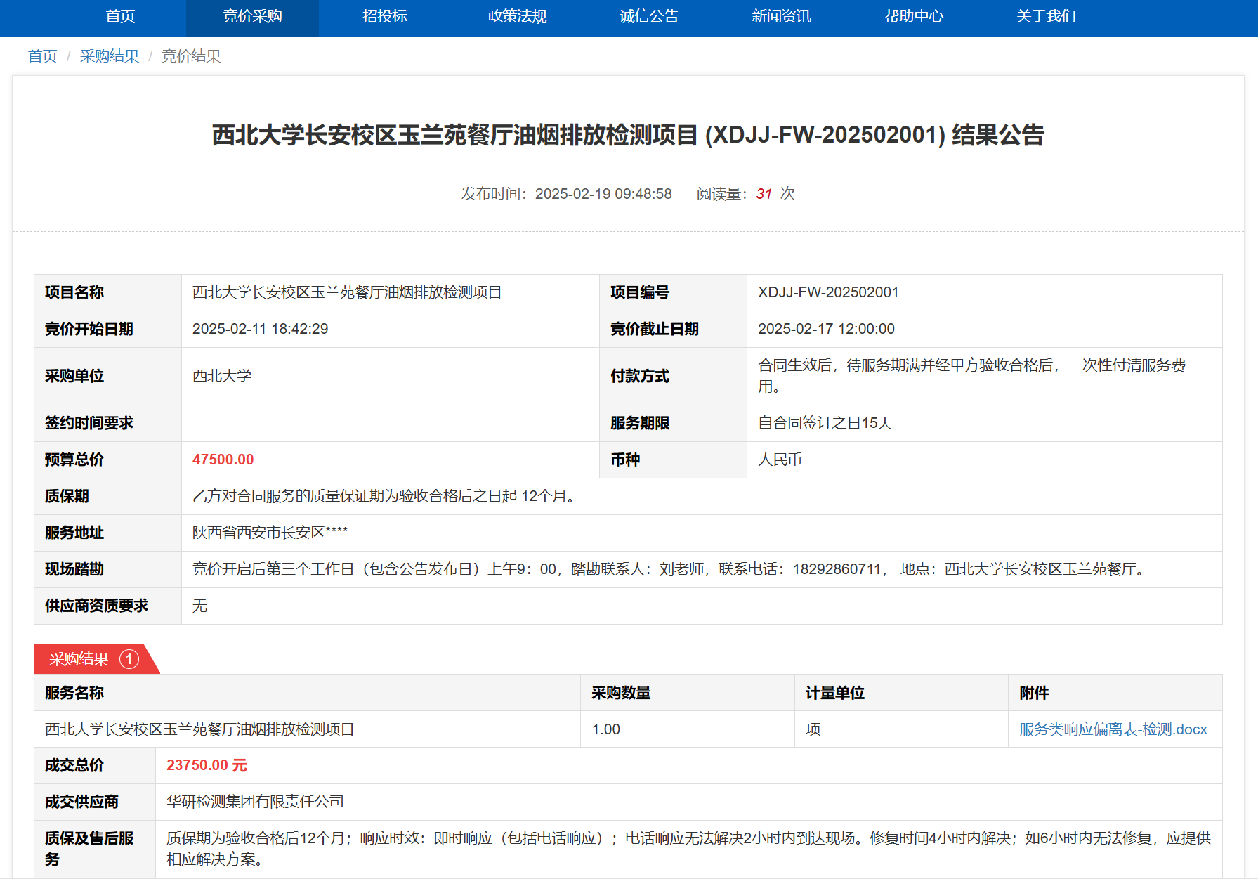 西北大学长安校区玉兰苑餐厅油烟排放检测项目(XDJJ-FW-202502001)竞价结果公告 作者:采购与招标办公室 编辑: 时间:2025-02-19 原公告链接:https://www.ejingcai.com.cn/site/bidding/detail/16552
