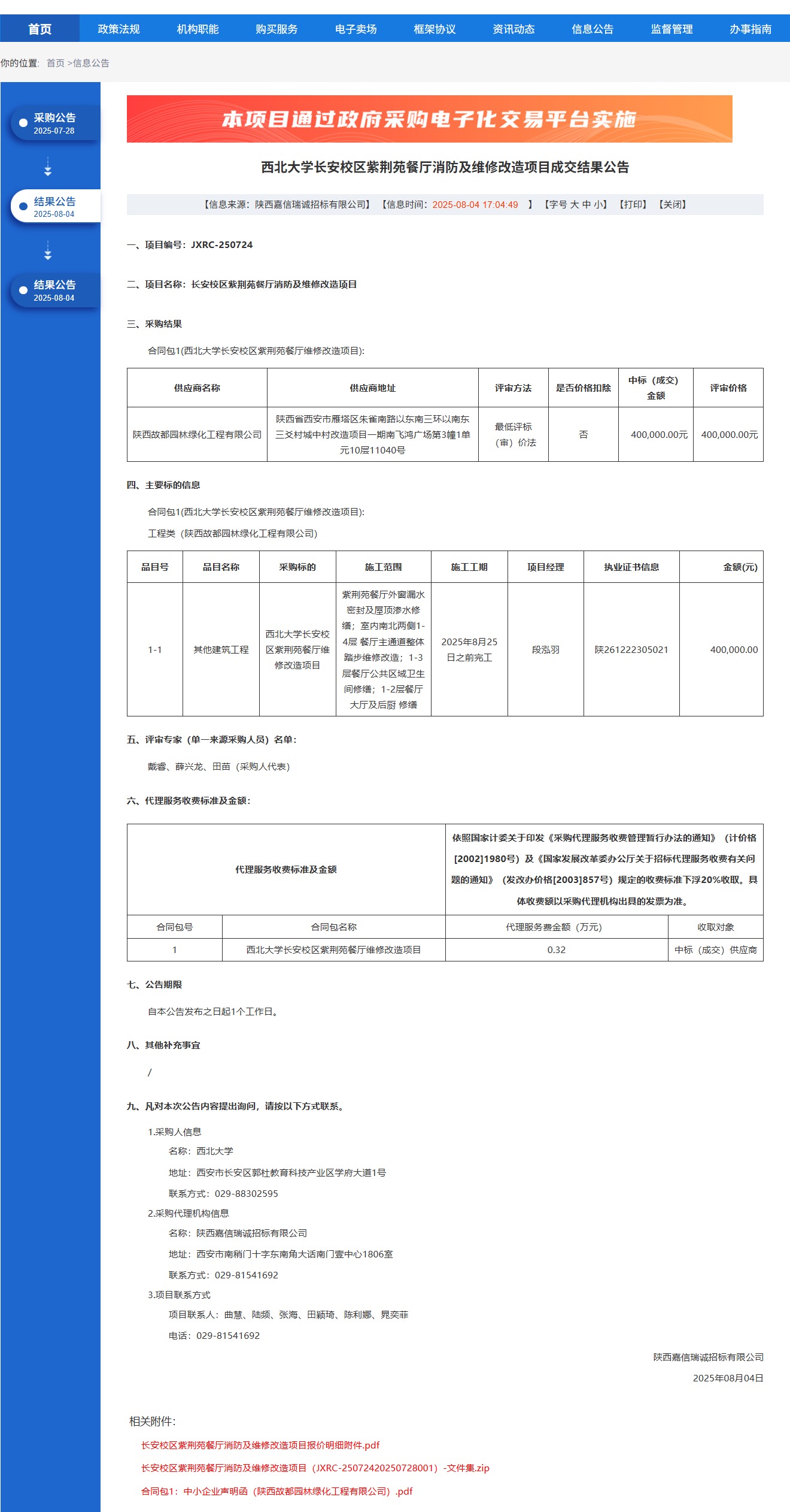 西北大学长安校区紫荆苑餐厅消防及维修改造项目成交结果公告 作者: 编辑:党丹珩 时间:2025-08-04 公告地址:http://www.ccgp-shaanxi.gov.cn/freecms/site/shaanxi/ggxx/info/2025/8a69c4d59860f6420198744983276ed2.html?noticeType=001023¬iceId=1f58d820-7114-11f0-8063-08c0eb20c666