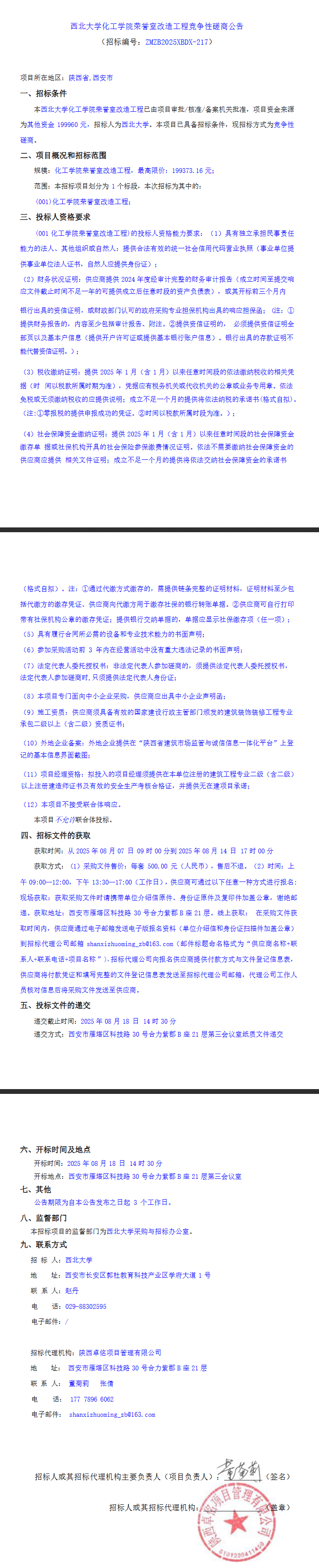 西北大学化工学院荣誉室改造工程竞争性磋商公告 作者: 编辑:党丹珩 时间:2025-08-08 公告地址:http://bulletin.sntba.com/biddingBulletin/2025-08-07/2091694.html