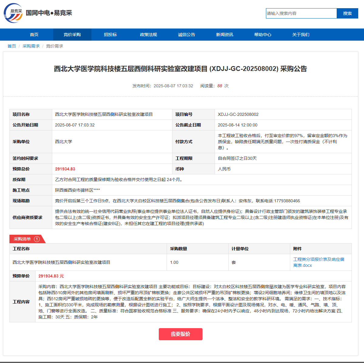 西北大学医学院科技楼五层西侧科研实验室改建项目 (XDJJ-GC-202508002) 采购公告 作者: 编辑:党丹珩 时间:2025-08-08 公告地址:https://www.ejingcai.com.cn/site/bidding/detail/19914