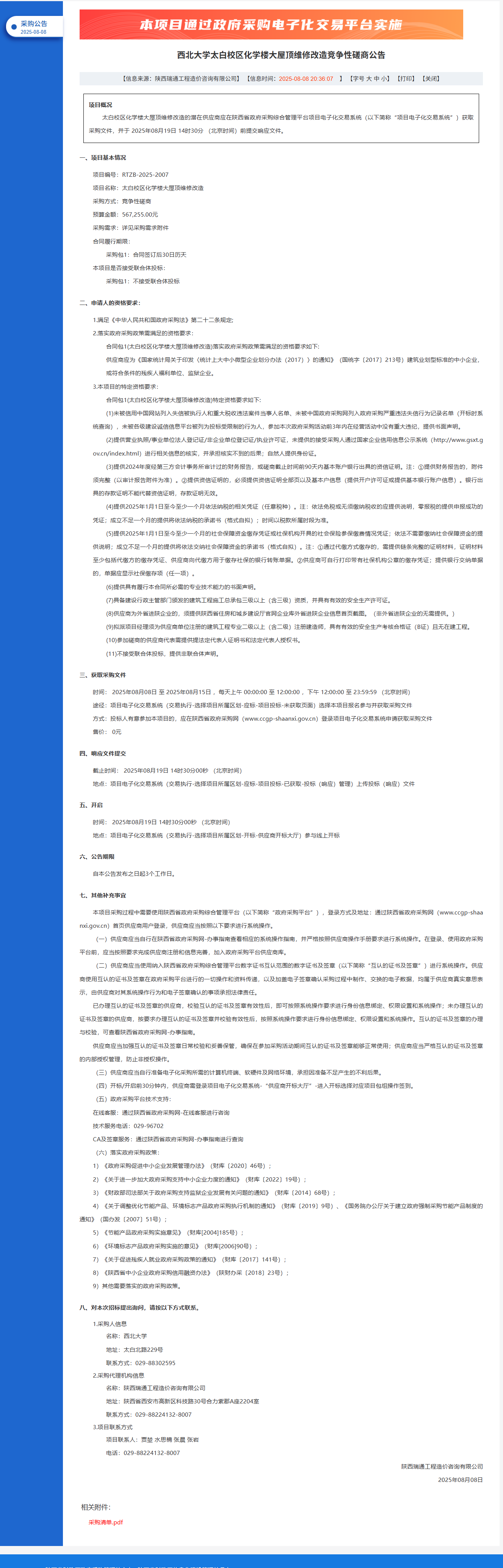 西北大学太白校区化学楼大屋顶维修改造竞争性磋商公告 作者: 编辑:党丹珩 时间:2025-08-08 公告地址:http://website.nwu.edu.cn:8080/system/caslogin.jsp;jsessionid=C175413E68D078CC4A954A9C17C72200