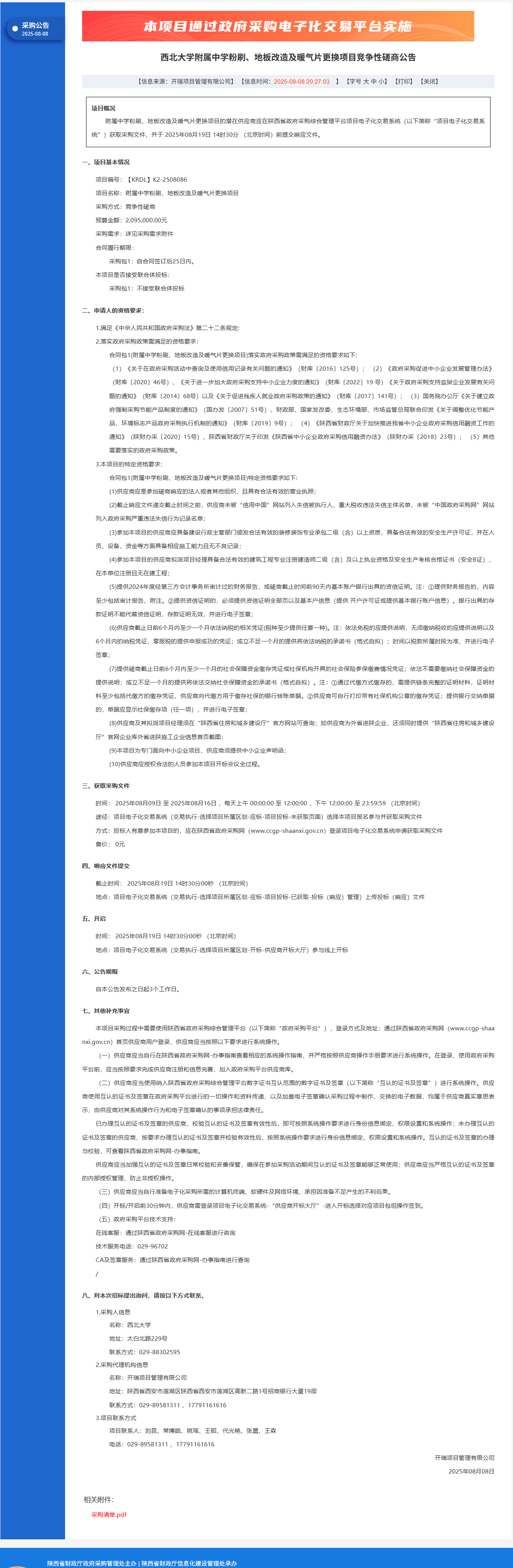 西北大学附属中学粉刷、地板改造及暖气片更换项目竞争性磋商公告 作者: 编辑:党丹珩 时间:2025-08-08 公告地址:https://www.ccgp-shaanxi.gov.cn/freecms/site/shaanxi/ggxx/info/2025/8a69c4d59860f6420198899b50a47f9c.html