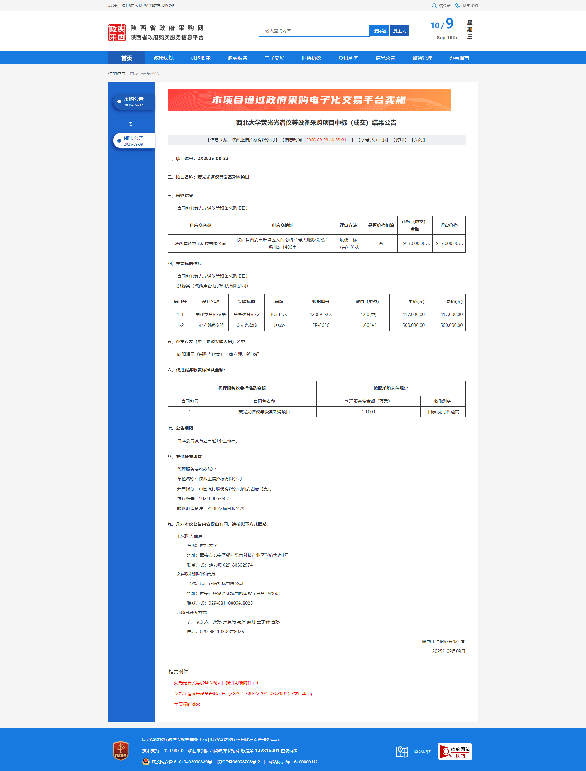 西北大学荧光光谱仪等设备采购项目中标(成交)结果公告