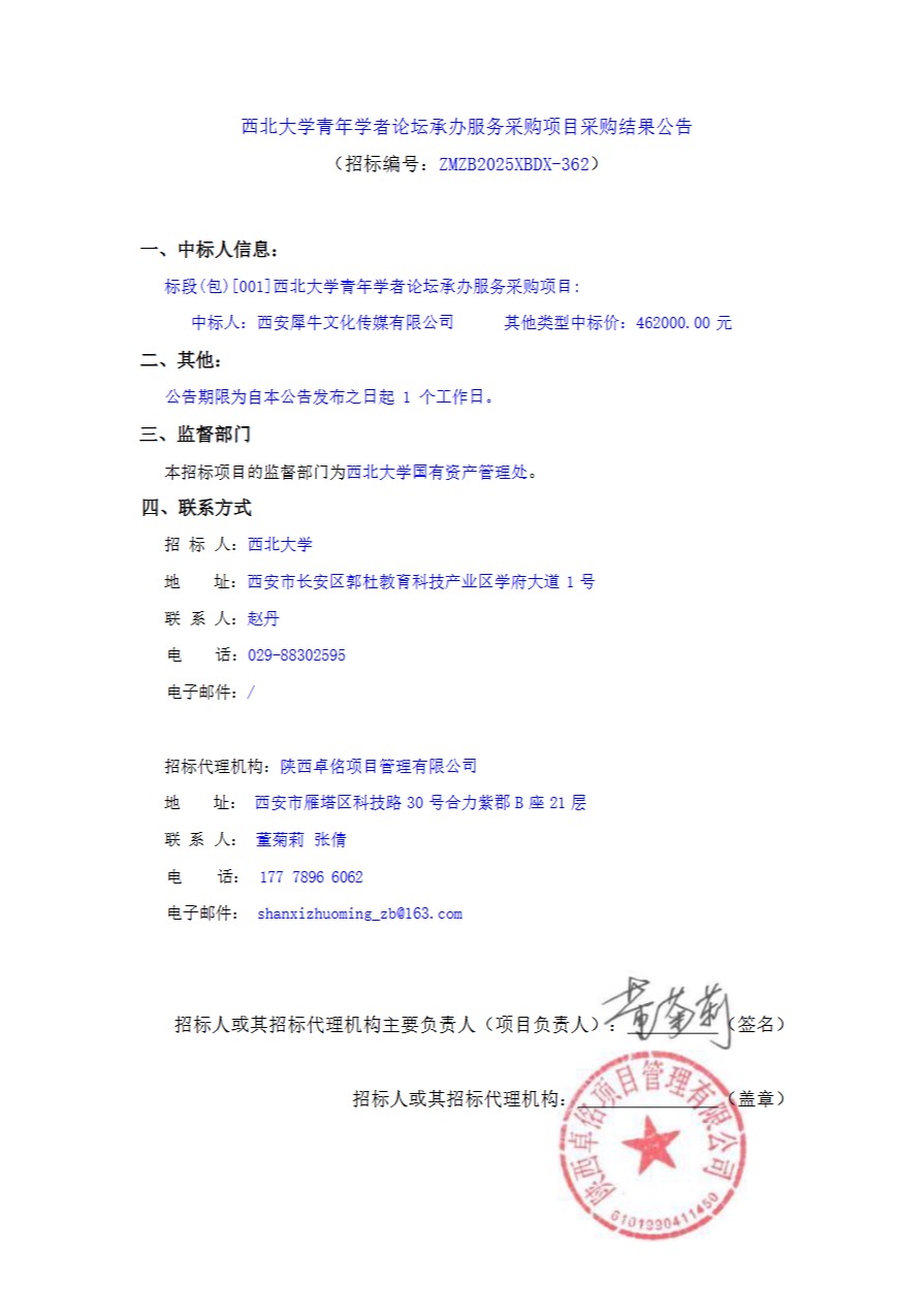 西北大学青年学者论坛承办服务采购项目采购结果公告