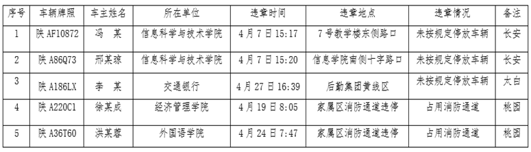 2023年4月份校园交通违章曝光 作者: 编辑: 时间:2023-05-10 为加强校内道路交通管理,规范校内交通秩序,根据《西北大学校园道路交通管理办法》的通知要求,现将2023年4月校园交通违章车辆曝光如下。 希望广大师生员工遵守校园道路交通管理办法,维护校园交通安全,共同营造良好的校园交通秩序。 西北大学道路交通安全委员会 2023年5月10日