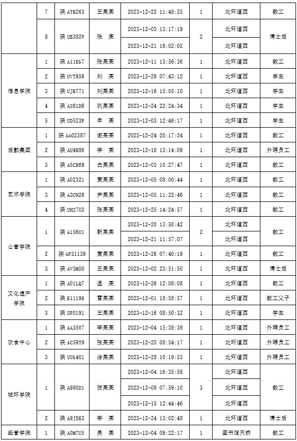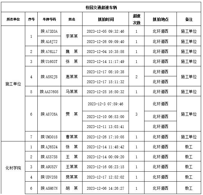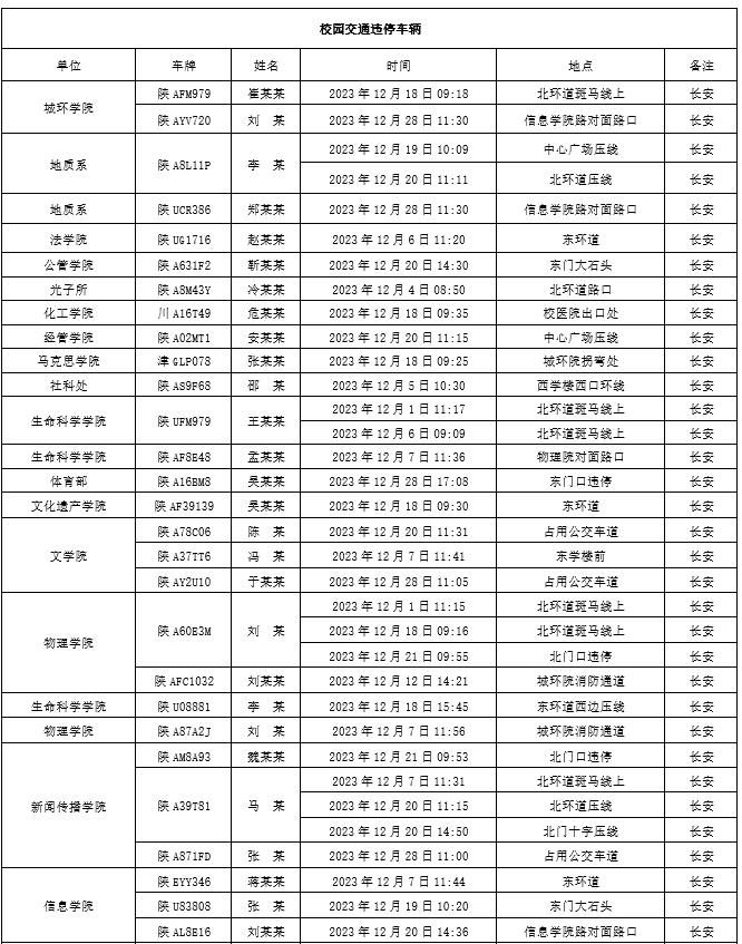为加强校内道路交通安全管理,规范校内交通秩序,根据《西北大学校园道路交通管理办法》有关要求,现将2023年12月校园交通违章车辆予以曝光,所在单位负责对本单位违章师生员工进行交通安全教育和日常管理。