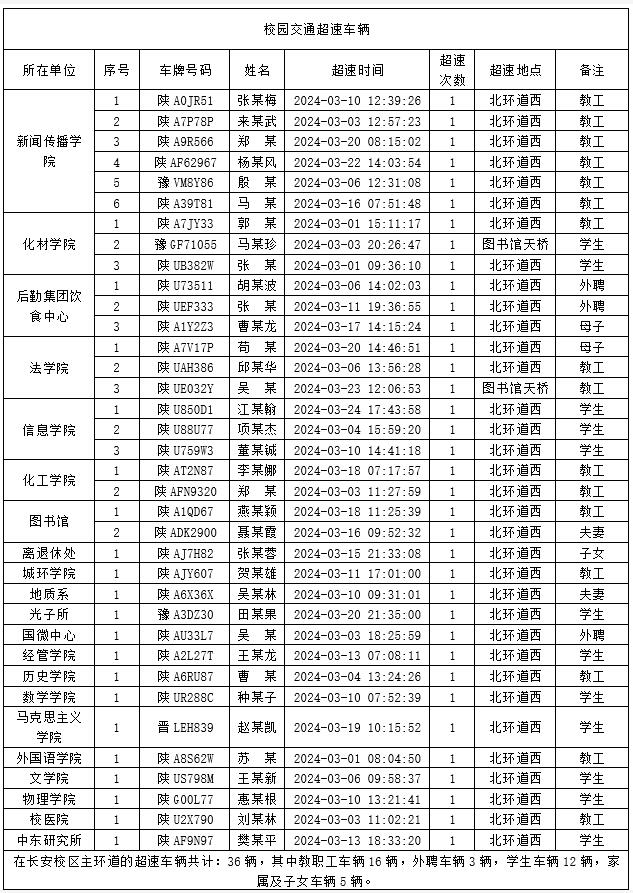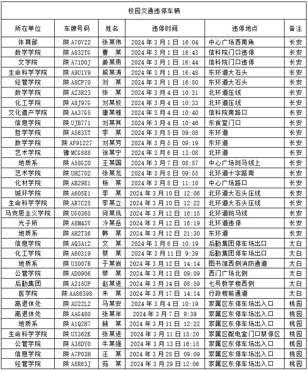 为加强校内道路交通安全管理,规范校内交通秩序,根据《西北大学校园道路交通管理办法》有关要求,现将2024年3月校园交通违章车辆予以曝光,所在单位负责对本单位违章师生员工进行交通安全教育和日常管理。
