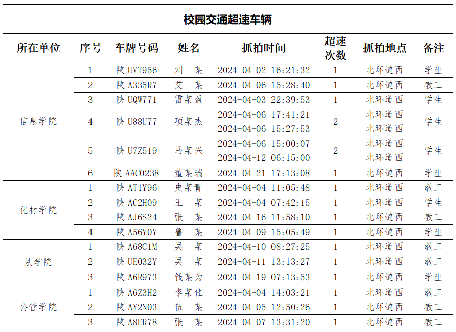 为加强校内道路交通安全管理,规范校内交通秩序,根据《西北大学校园道路交通管理办法》有关要求,现将2024年4月校园交通违章车辆予以曝光,4月份教工超速车辆占52%、学生超速车辆占35%、外聘职工及教工家属车辆占12%,请所在单位加强对本单位违章师生员工的教育和管理,对于校内曝光超速的学生车辆将取消下一年度的通行证办理资格。