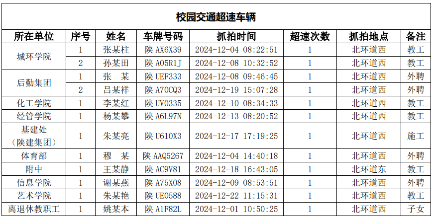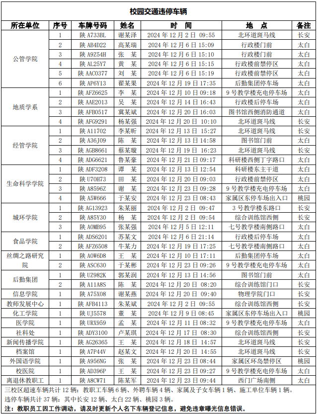 为进一步加强校园交通管理,保障校园交通安全有序,维护学校正常的教学、科研和生活秩序以及师生员工的人身财产安全,根据《西北大学校园交通安全管理规定》有关要求, 现将2024年11月校园交通违章车辆予以曝光,具体情况如下表。