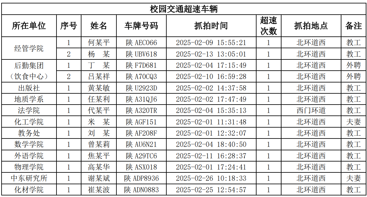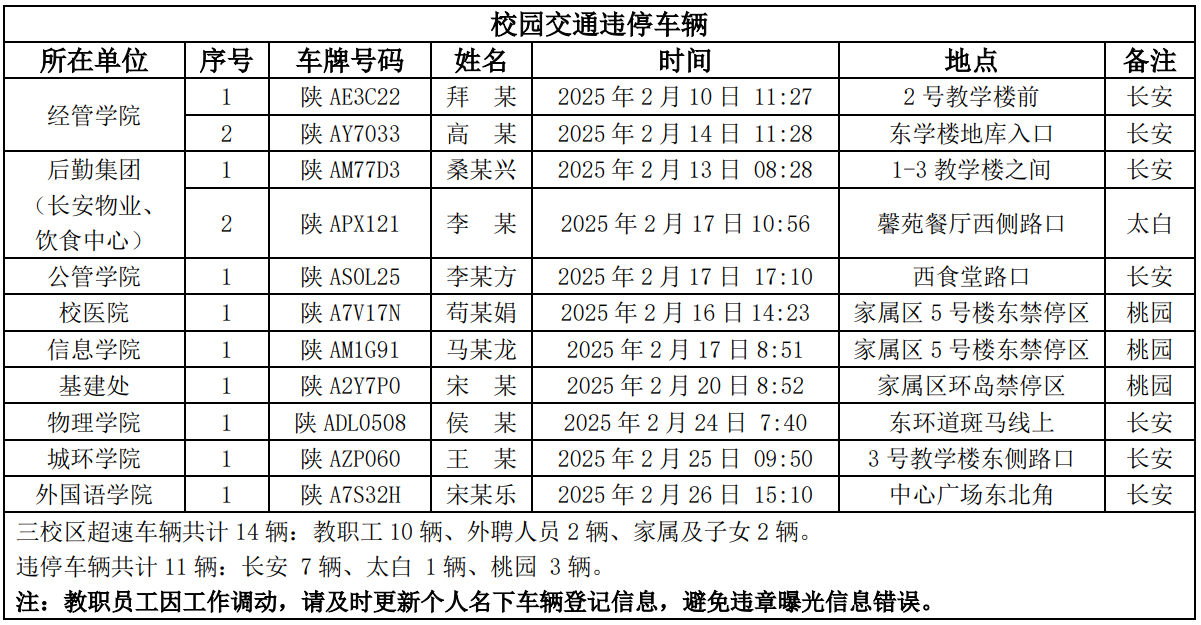 为进一步加强校园交通管理,保障校园交通安全有序,维护学校正常的教学、科研和生活秩序,切实保护师生员工的人身财产安全,根据《西北大学校园交通安全管理规定》的相关要求,现将2025年2月校园交通违章车辆予以曝光,具体要求与违章信息如下。
