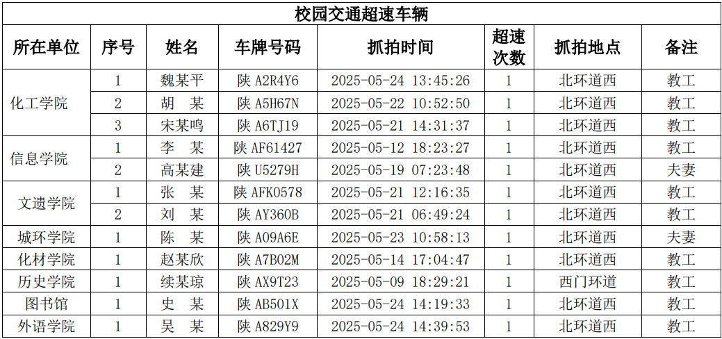 为进一步加强校园交通管理,保障校园交通安全有序,维护学校正常的教学、科研和生活秩序,切实保护师生员工的人身财产安全,根据《西北大学校园交通安全管理规定》的相关要求,现将2025年5月校园交通违章车辆予以曝光,具体要求与违章信息如下:
