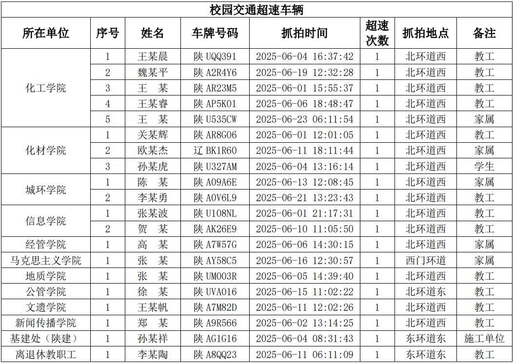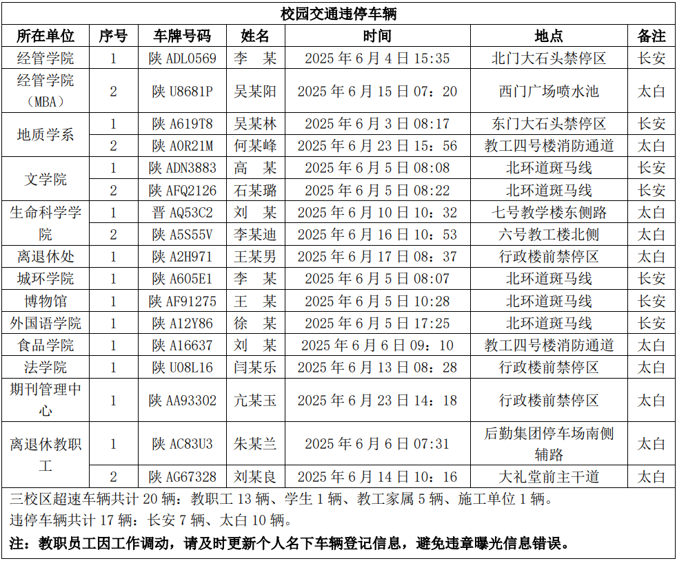 为进一步加强校园交通管理,保障校园交通安全有序,维护学校正常的教学、科研和生活秩序,切实保护师生员工的人身财产安全,根据《西北大学校园交通安全管理规定》的相关要求,现将2025年6月校园交通违章车辆予以曝光,具体要求与违章信息如下: