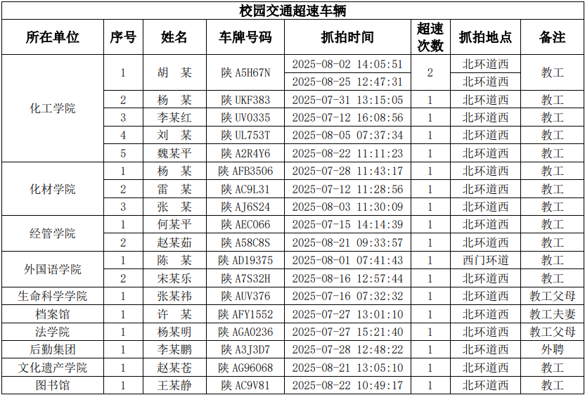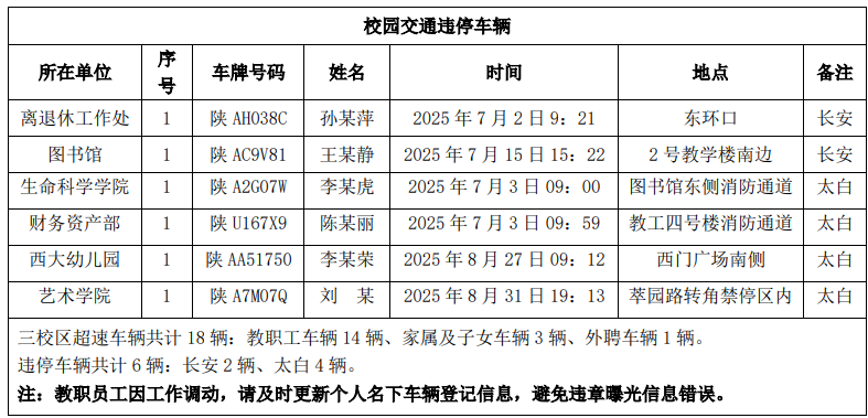 为进一步加强校园交通管理,保障校园交通安全有序,维护学校正常的教学、科研和生活秩序,切实保护师生员工的人身财产安全,根据《西北大学校园交通安全管理规定》的相关要求,现将2025年7月-8月校园交通违章车辆予以曝光,具体要求与违章信息如下: