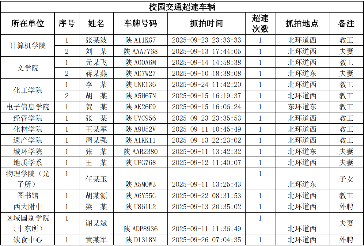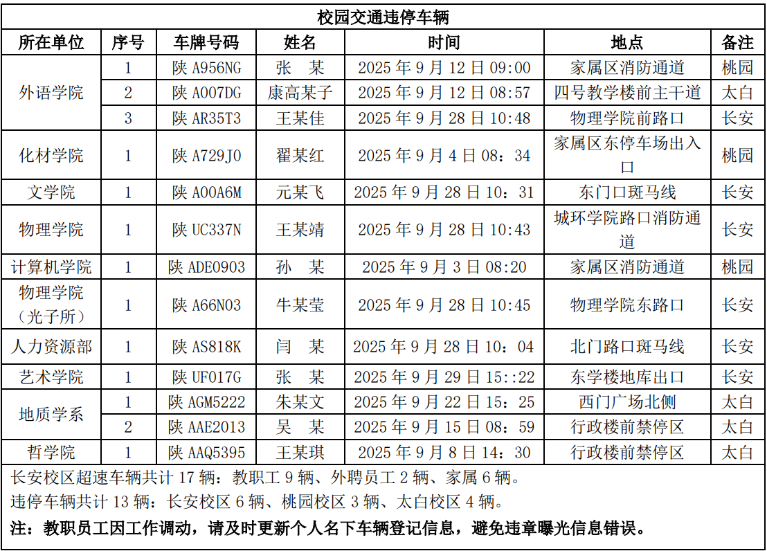 为进一步加强校园交通管理,保障校园交通安全有序,维护学校正常的教学、科研和生活秩序,切实保护师生员工的人身财产安全,根据《西北大学校园交通安全管理规定》的相关要求,现将2025年9月校园交通违章车辆予以曝光,具体要求与违章信息如下: