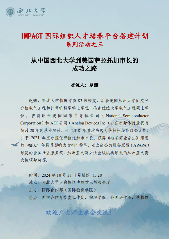 IMPACT国际组织人才培养平台搭建计划系列活动之三:从中国西北大学到美国萨拉托加市长的成功之路 作者: 编辑:张兆慧 时间:2024-10-28 (撰稿人:国际部出国办 发布人:张兆慧 审核人:任惠莲)