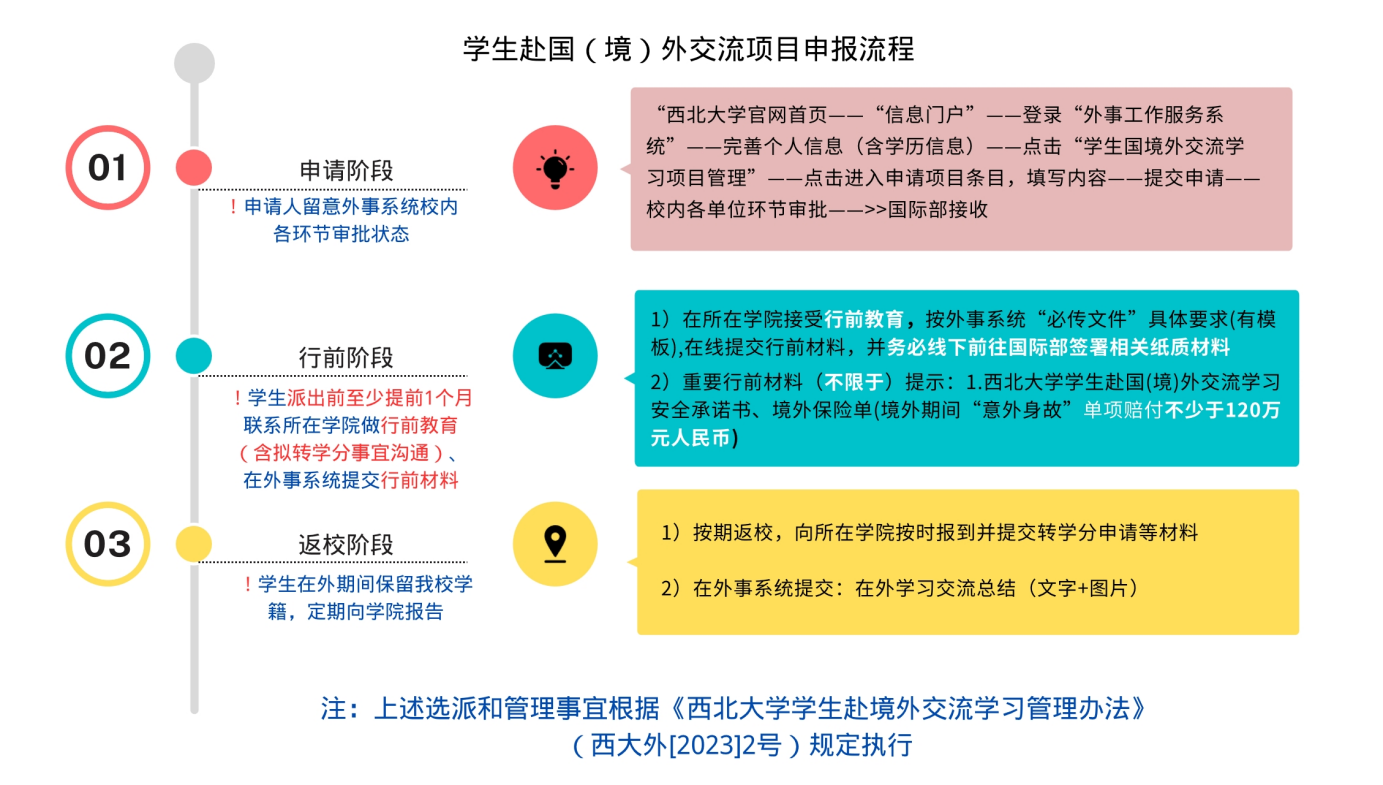 1.【校内申请】:有意向申报学生于2025年4月1日前完成西北大学外事工作服务系统在线申请,并跟进系统审核进度,4月5日前获得除国际部外校内单位审批。