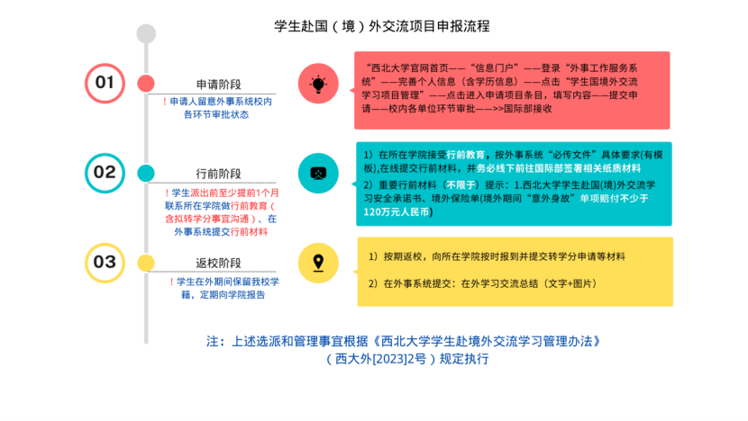 有意向申报学生于2025年10月25日前完成提交在西北大学外事工作服务系统的在线申请,并跟进系统审核进度,在10月31日前获得除国际部外校内单位审核通过。