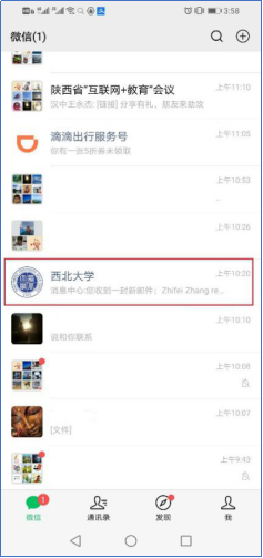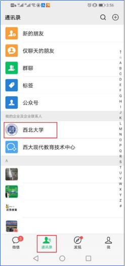 进入微信后,点击屏幕下方的“通信录”,在通信录中点击“西北大学”(如图3所示),通过通信录进入西北大学企业号后,点击“企业应用”菜单项(如图4所示),即可显示我校企业号里集成的所有应用服务。