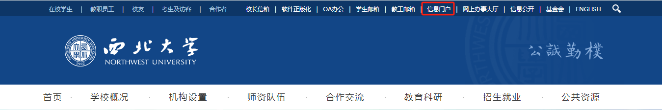 打开学校官方网站,点击首页“信息门户”入口,或通过域名“https://open.nwu.edu.cn/index”访问,输入统一身份认证账号(即学号或工号)和密码,即可进入信息门户系统。(温馨提醒:请妥善保管密码,以免因密码泄露导致个人信息安全问题)