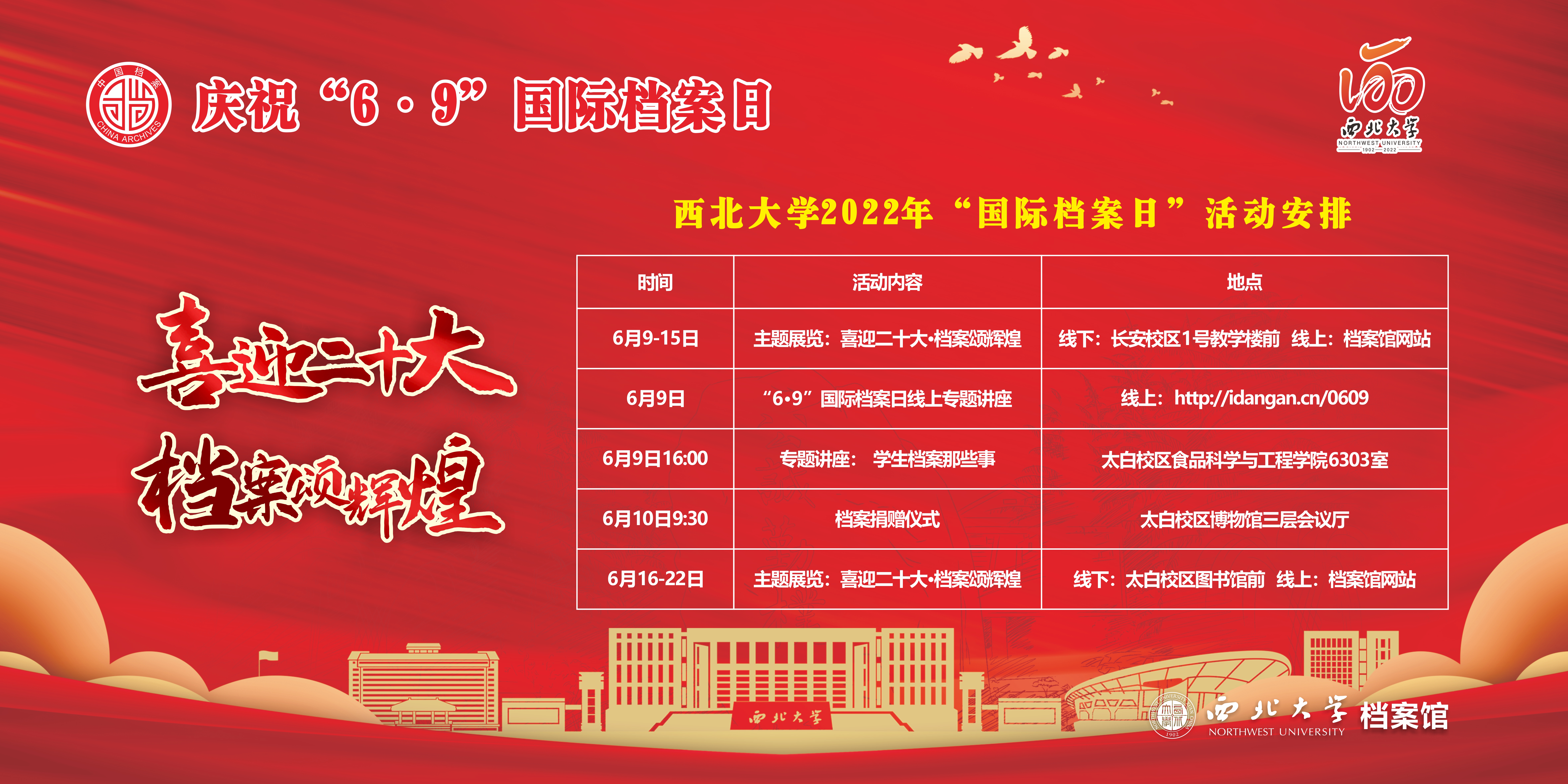 西北大学2022年国际档案日活动安排 作者: 编辑:孙可佳 时间:2022-06-09 为庆祝中国共产党第二十次全国代表大会召开和西北大学建校120周年,宣传贯彻落实新修订的《中华人民共和国档案法》,不断增强全校师生档案意识,助力学校“双一流”建设,积极发挥档案工作“记载历史、传承文明、服务未来”的作用和档案“存凭、留史、资政、育人”的功能,讲好西大故事。在“6· 9”国际档案日和西北大学120周年校庆活动来临之际,学校举办主题为“喜迎二十大•档案颂辉煌”的国际档案日系列宣传活动。 具体活动安排如下,欢迎广大师生踊跃参加!