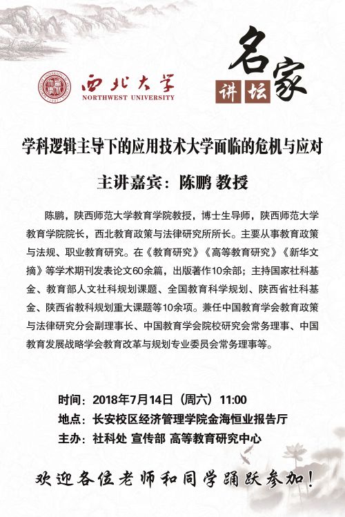 关于举办"名家讲坛"暨"高等教育论坛"(第十四期)的通知 作者: 编辑: 时间:2018-07-12 11:50 校内各有关单位:西北大学名家讲坛暨高等教育论坛(第十四期)即将举行,现将具体情况通知如下:讲座题目:学科逻辑主导下的应用技术大学面临的危机与应对主讲嘉宾:陈 鹏 教授讲座时间:7月14日(周六)11:00讲座地点:西北大学长安校区经济管理学院金海恒业报告厅主办单位:社科处、宣传部、高等教育研究中心欢迎各位老师和同学踊跃参加!