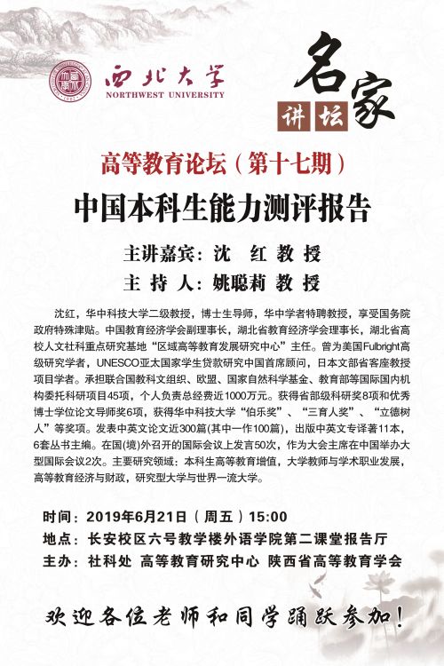 关于举办"名家讲坛"暨"高等教育论坛"(第十七期)的通知 作者: 编辑: 时间:2019-06-19 10:43 校内各有关单位:西北大学名家讲坛暨高等教育论坛(第十七期)即将举行,现将具体情况通知如下:讲座题目:中国本科生能力测评报告主讲嘉宾:沈 红 教授讲座时间:6月21日(周五)15:00讲座地点:长安校区六号教学楼外语学院第二课堂报告厅主办单位:社科处、高等教育研究中心、陕西省高等教育学会欢迎各位老师和同学踊跃参加!