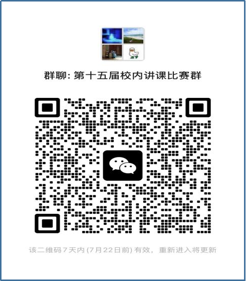 另请参赛选手及时扫码,加入“第十五届西北大学讲课比赛”微信群,以便通知后续比赛相关事宜。