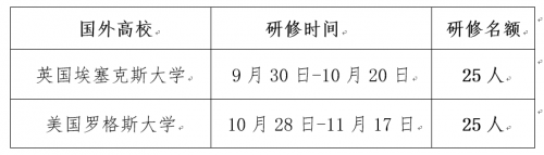 为进一步提升我校中青年教师国际化视野,加强对外交流与合作,有效提升教学能力与水平,提高人才培养质量,助推“双一流”建设。教师发展中心拟定于2018年9月至11月组织相关学科优秀中青年教师赴英国埃塞克斯大学和美国罗格斯大学进行教学专题研修,现面向校内相关专业遴选优秀中青年教师,具体事宜如下: