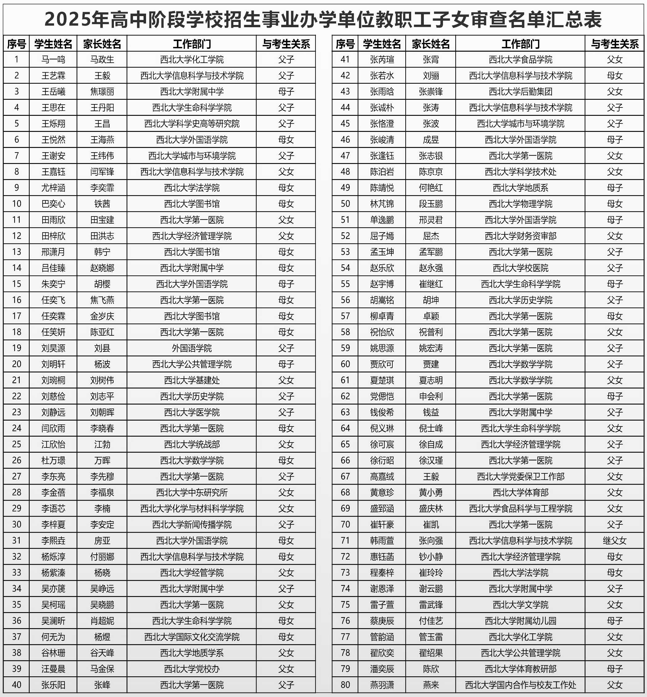 关于2025年高中阶段学校招生西北大学正式事业编制的教职工直系初中应届毕业子女审查结果的公示 作者: 编辑:唐毅 时间:2025-05-19 根据市、区教育局通知及要求,我校于2025年5月13日开展2025年高中阶段学校招生西北大学正式事业编制的教职工直系初中应届毕业子女审查工作。经大学人力资源部门、纪检部门审核,通过名单如下(按学生姓氏笔画数排序): 现予以公示,公示时间为5月19日至5月21日。公示期内,如对公示名单有异议,可通过来电形式向我校反映。 电 话:88363909 西北大学附属中学 2025年5月19日