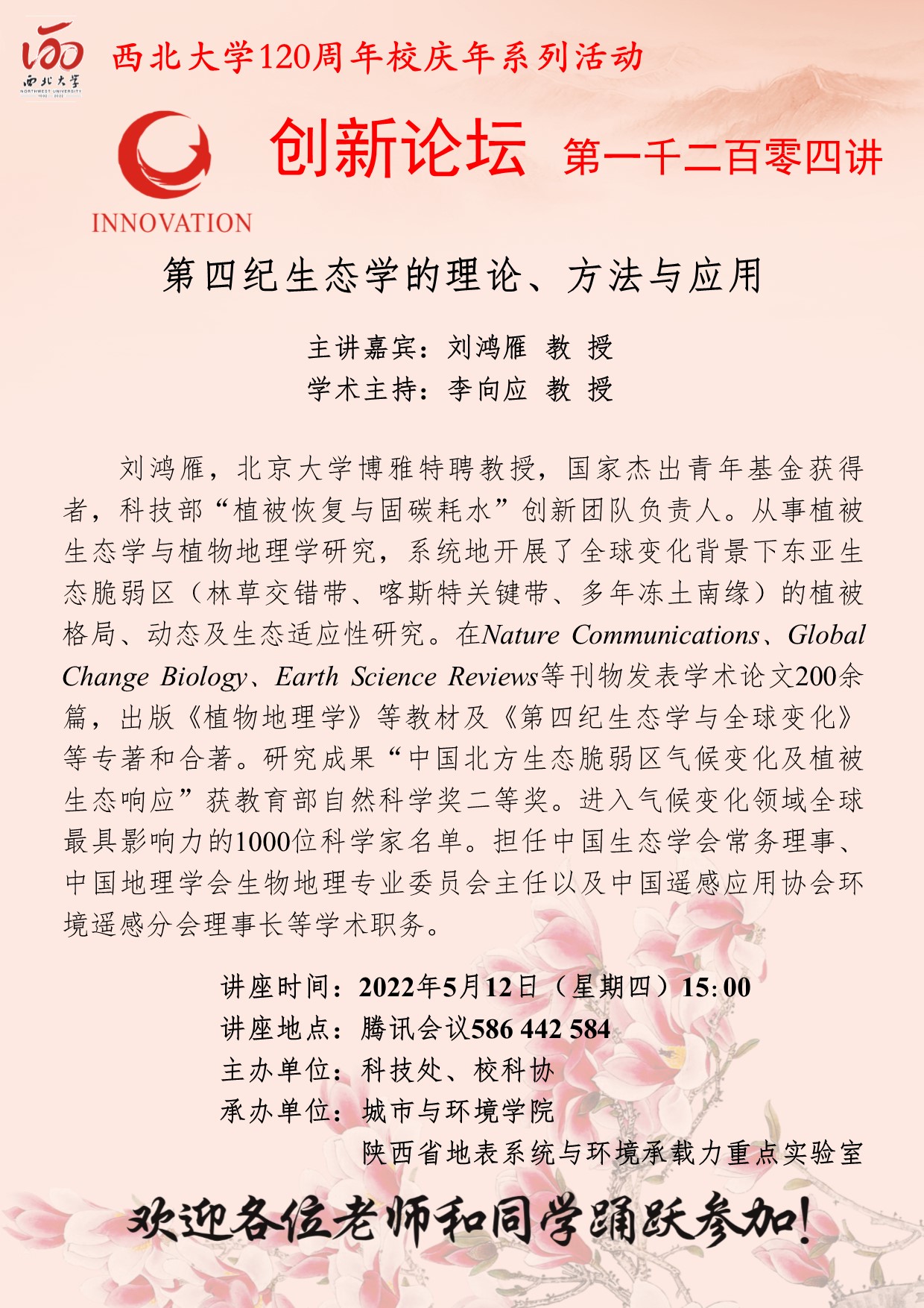 西北大学创新论坛第一千二百零四讲暨120周年校庆年系列活动:第四纪生态学的理论、方法与应用