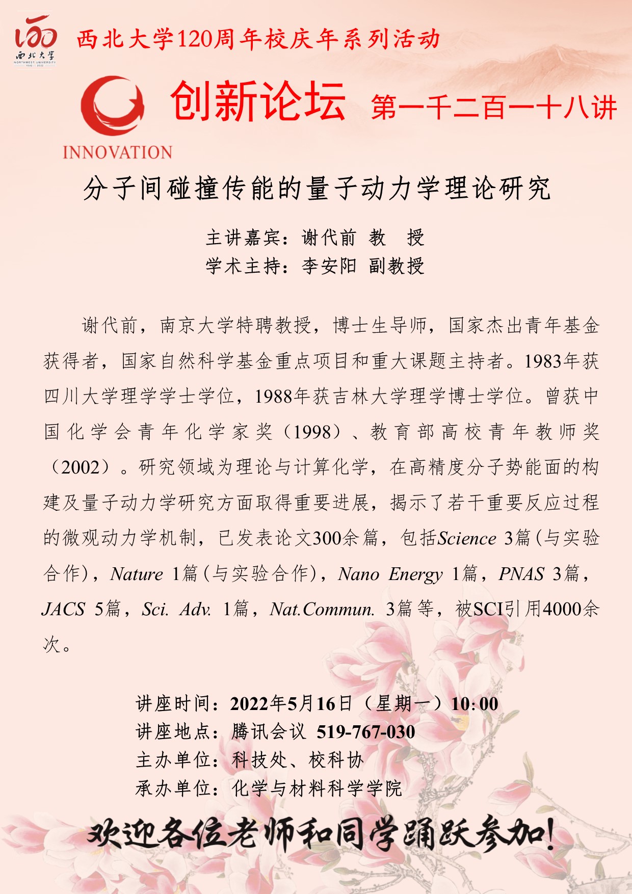 西北大学创新论坛第一千二百一十八讲暨120周年校庆年系列活动:分子间碰撞传能的量子动力学理论研究