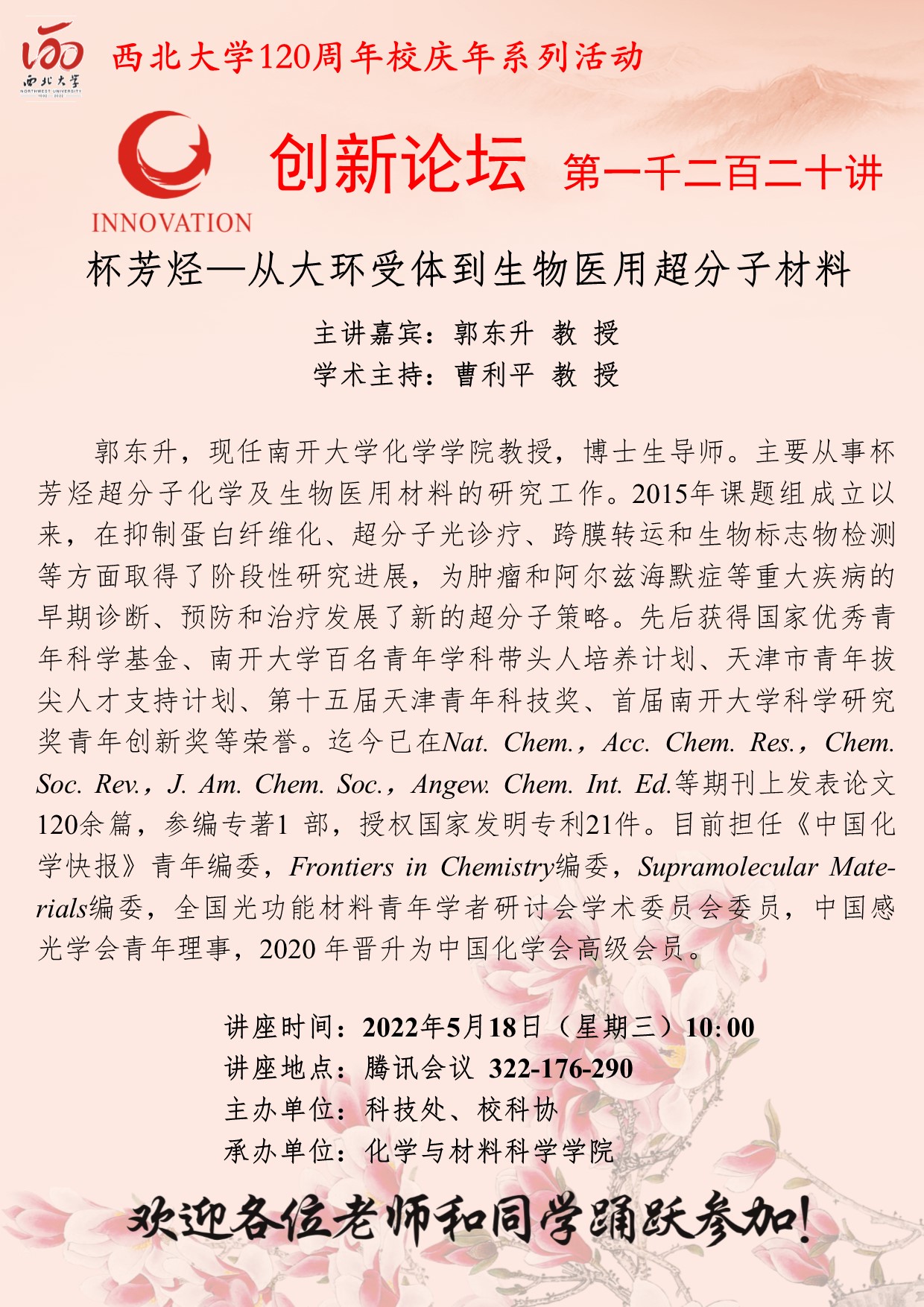 西北大学创新论坛第一千二百二十讲暨120周年校庆年系列活动:杯芳烃—从大环受体到生物医用超分子材料
