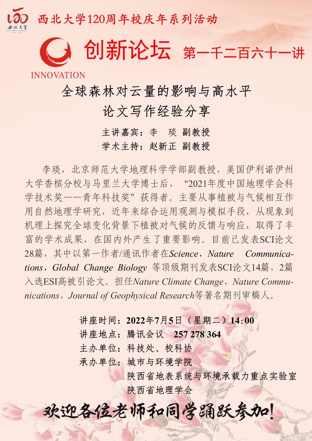 西北大学创新论坛第一千二百六十一讲暨120周年校庆年系列活动:全球森林对云量的影响与高水平论文写作经验分享