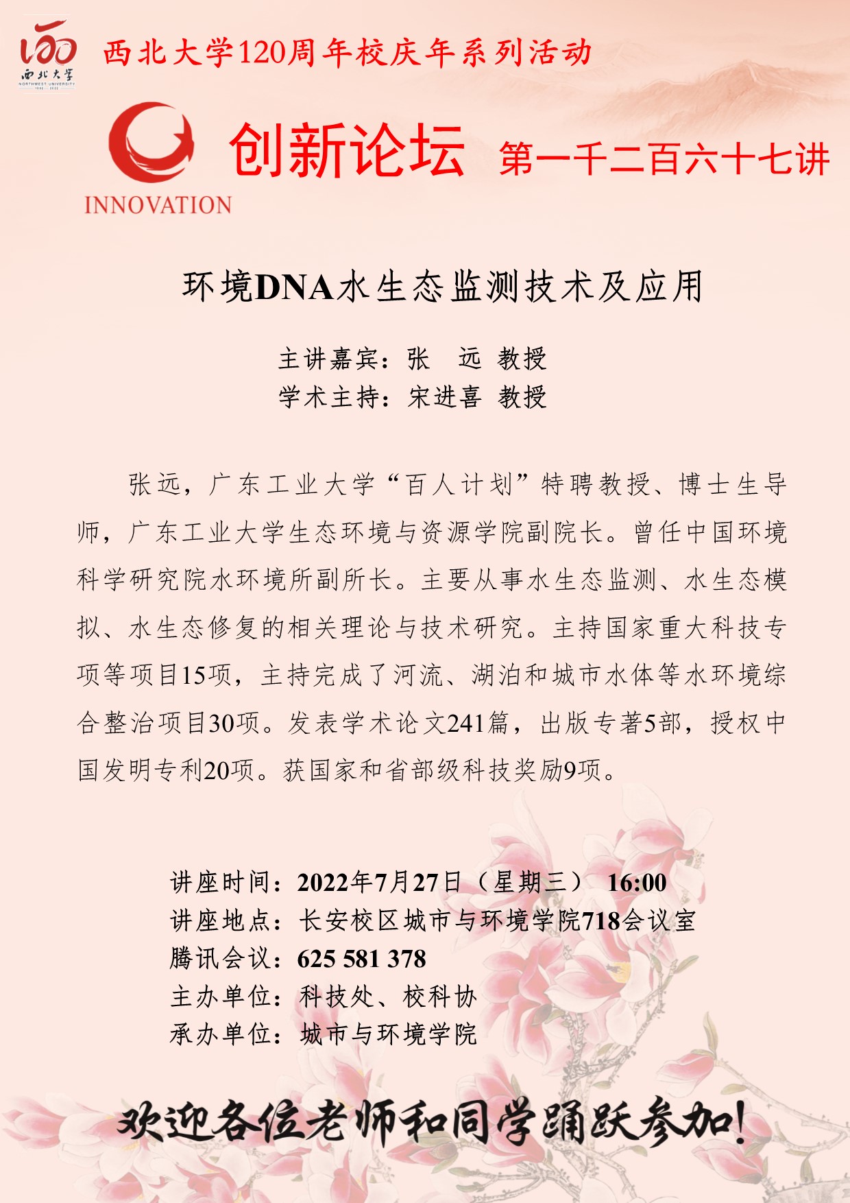 西北大学创新论坛第一千二百六十七讲暨120周年校庆年系列活动:环境DNA水生态监测技术及应用