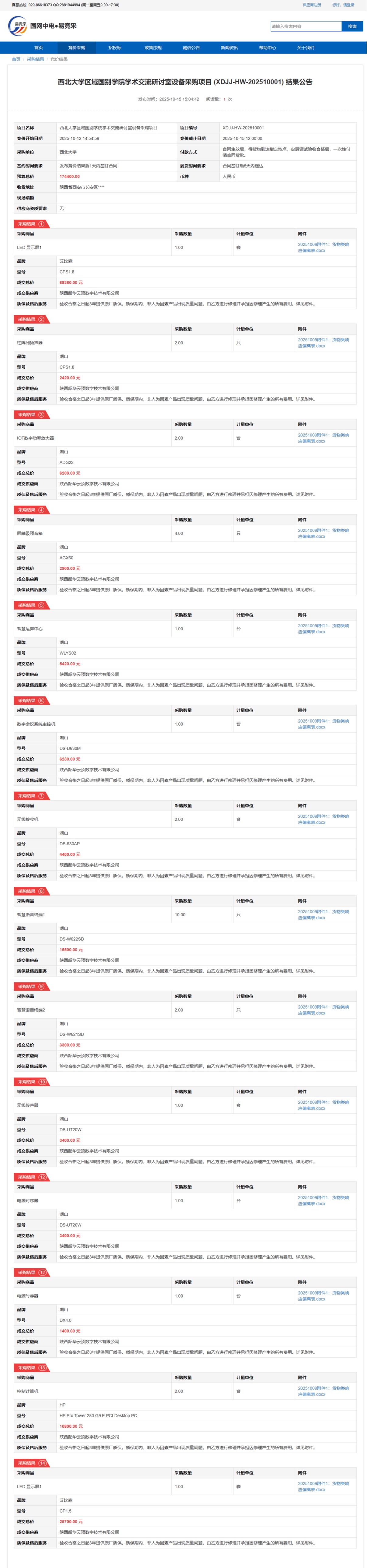 西北大学区域国别学院学术交流研讨室设备采购项目(XDJJ-HW-202510001)竞价结果公告